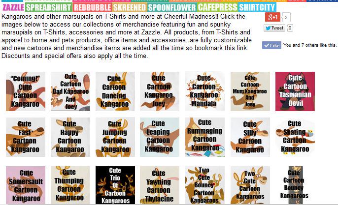 Kangaroos, Tasmanian devils, thylacines and other marsupials on T-Shirts and more at Cheerful Madness!! Click the images below to access our collections of merchandise featuring fun and spunky marsupials on T-Shirts, accessories and more at Zazzle. All products, from T-Shirts and apparel to home and pets products, office items and accessories, are fully customizable and new cartoons and merchandise items are added all the time so bookmark this link. Discounts and special offers also apply all the time.
